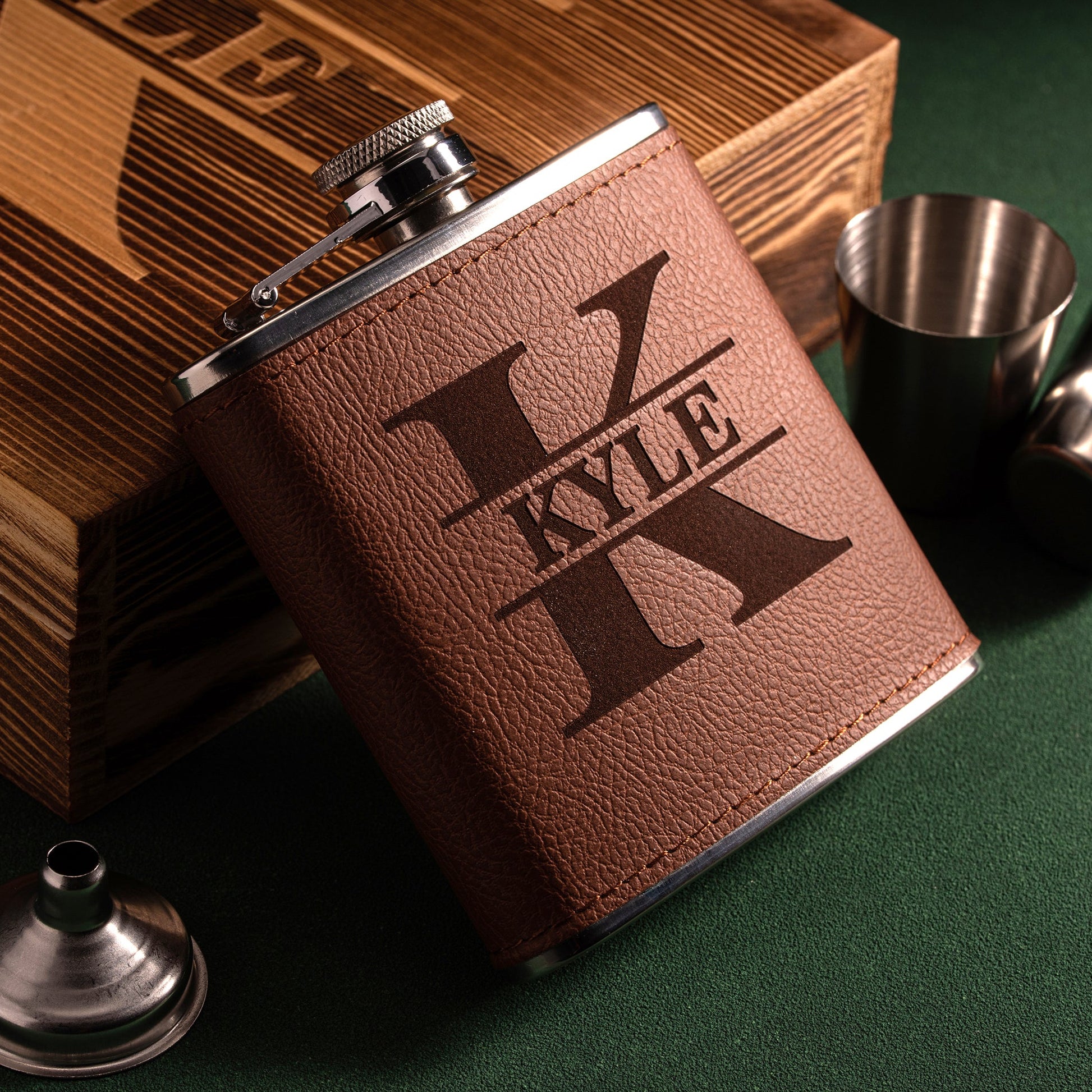Personalized flask set in wooden gift box. they are all can be completely customized to your request. Which is a great gift for boyfriend, husband, groomsmen, best man, your beloved dad, groom, it's also a good choice for birthday, graduation, wedding party, holiday, anniversary, valentines day, Christmas gift or any other occasion.